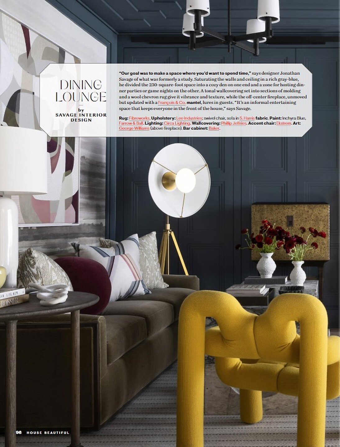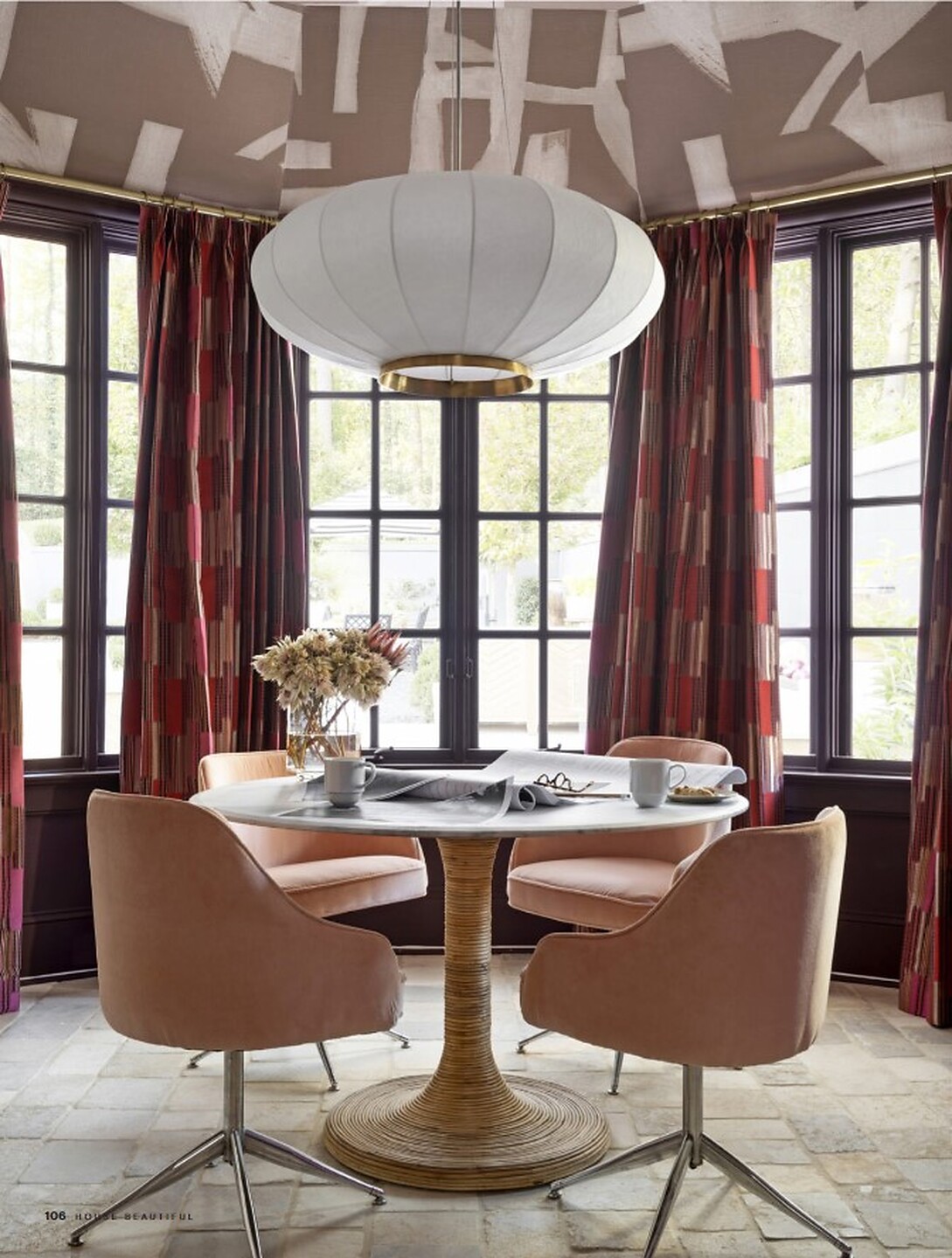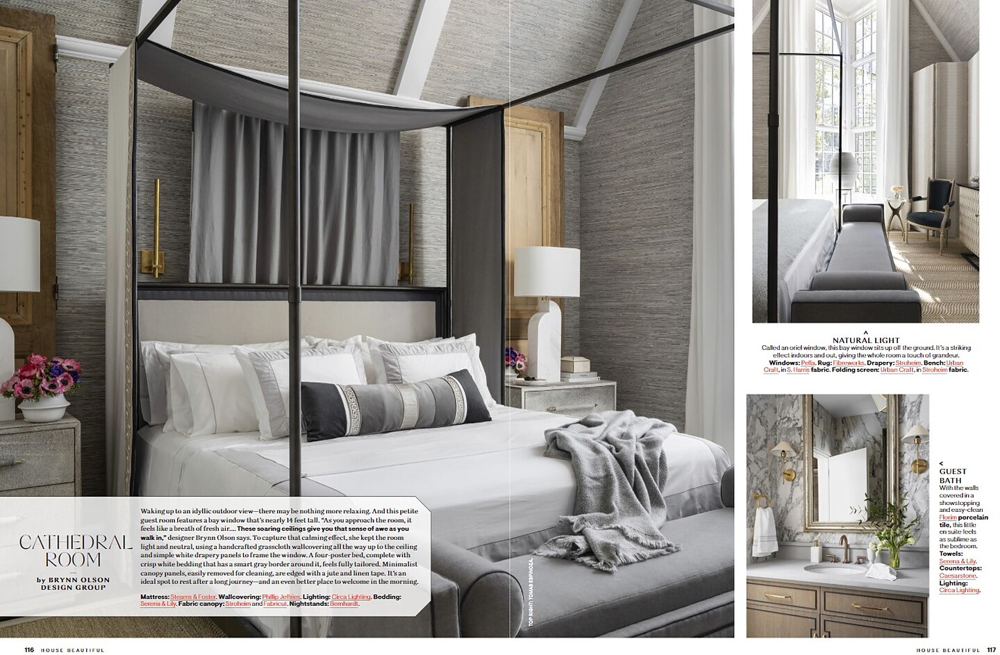 In the article "A New Beginning", interior designer Savage Interiors featured Fade 7221 Lavender Sand on Manila Hemp in the dining lounge. In the "Kitchen" interior designer Whittney Parkinson featured Driftwood 6206 Heather Grey.  In section "WFH" interior designer Ariene Betha featured Offset 9136 Clay Blush on Cotton Canvas Linen on the ceiling of the office, in "Guest Chambers" Bryann Olson featured Sateen Club 4956 Pussywillow, Silky Stings 3821 Hope Diamond, Soho Hemp 5515 Posh Periwinkle, Coffered Wood 4255 Polare. In the "Cathedral Room" Bryann Olson featured Metro Montage 9284 Pale Quartz, Watermark 4720 Lucid White, Shoreline Grass 9156 Hermit Crab.