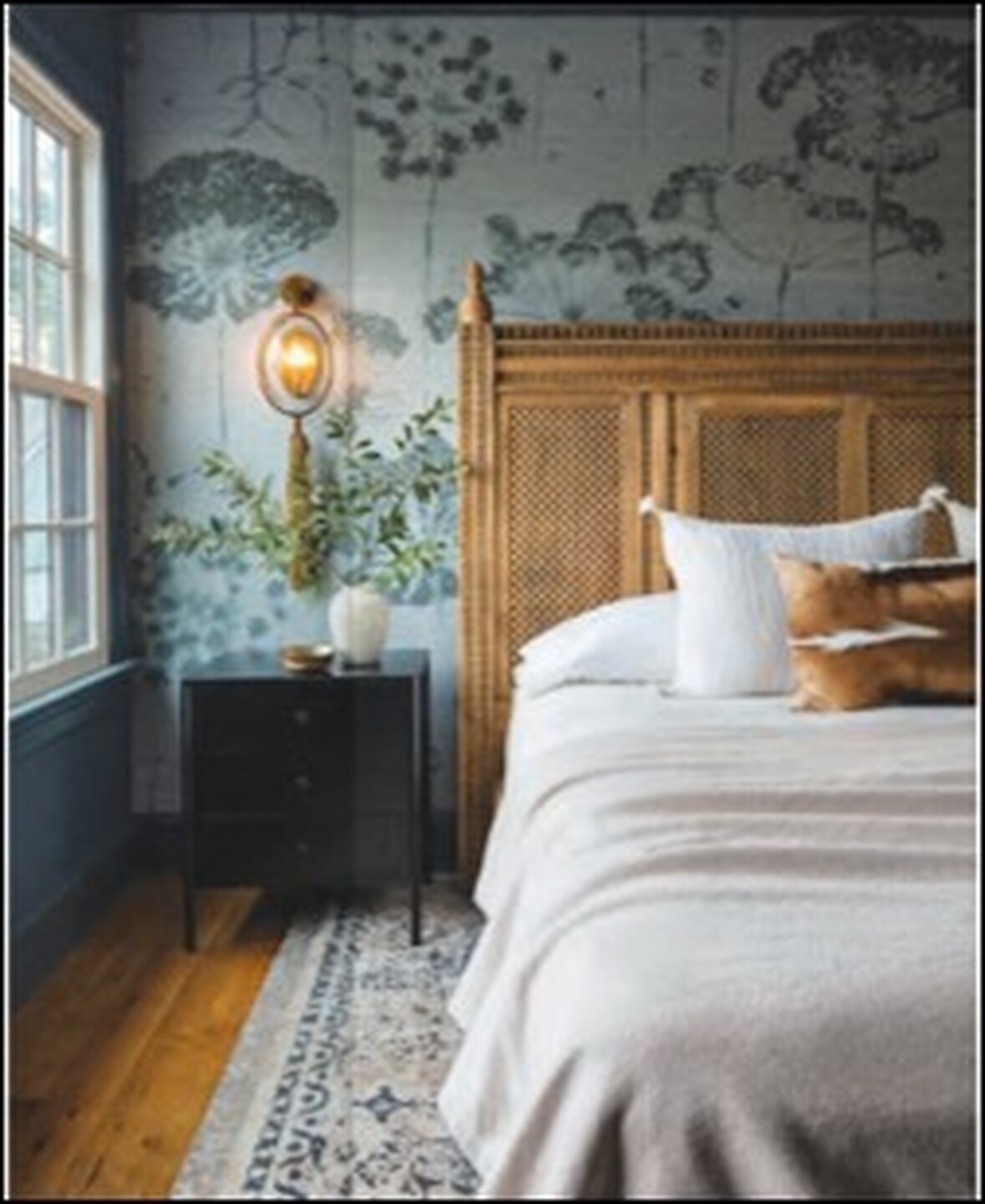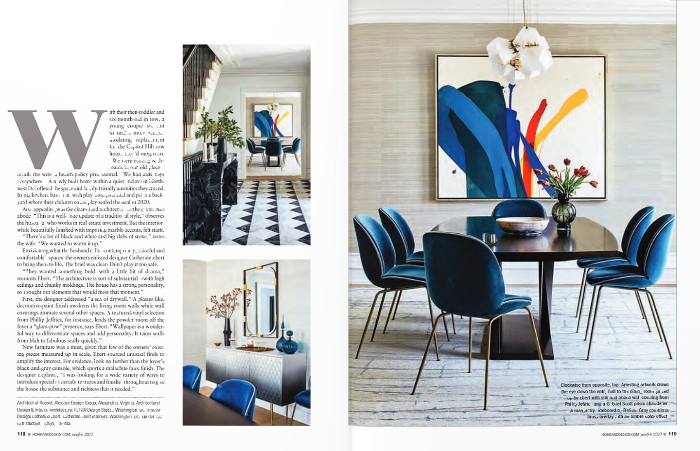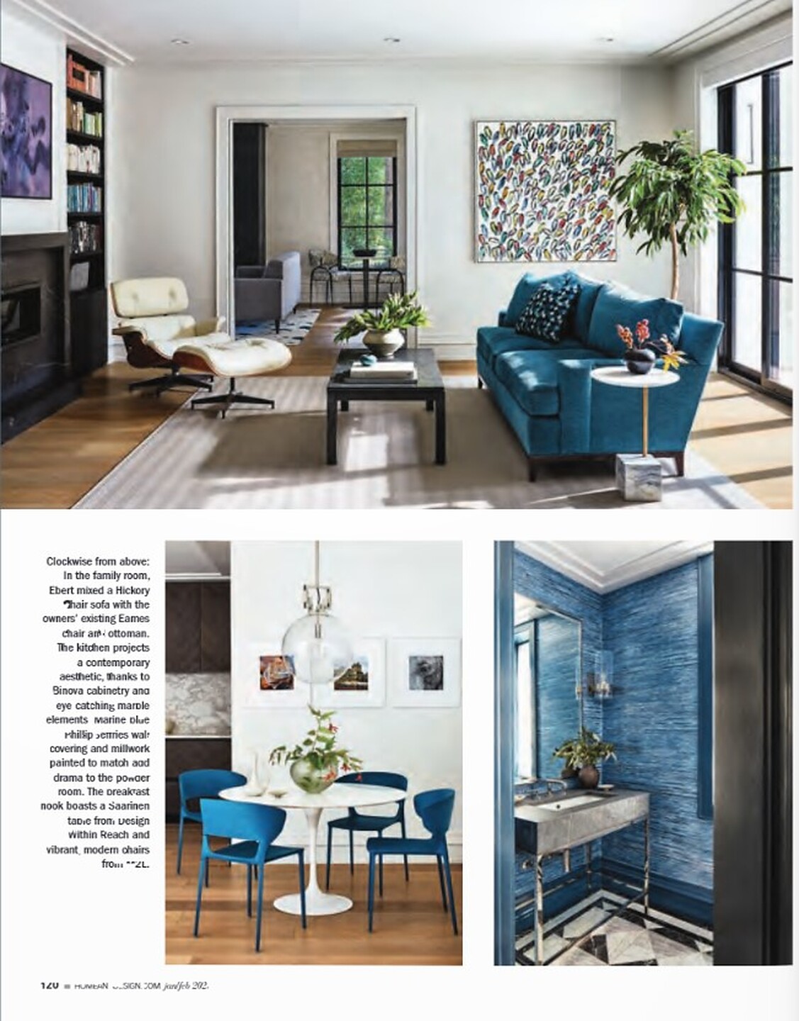 In the article "Dark Side" interior designer Ann Gottlieb featured Wish 6104 Bright Side on Spring Linen in the bedroom of a clients home. In the article "Bold Strokes" interior designer Catherine Ebert featured Silk and Abaca 3216 Porcelain Palace in the dining room, and Vinyl Gilded Age 7455 Bell Blue in the powder room of a clients home.