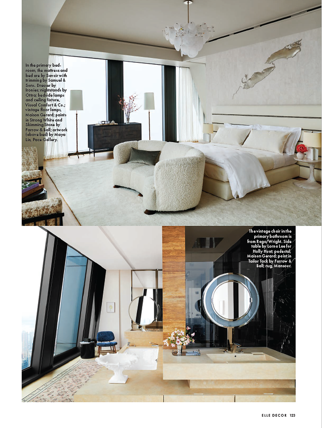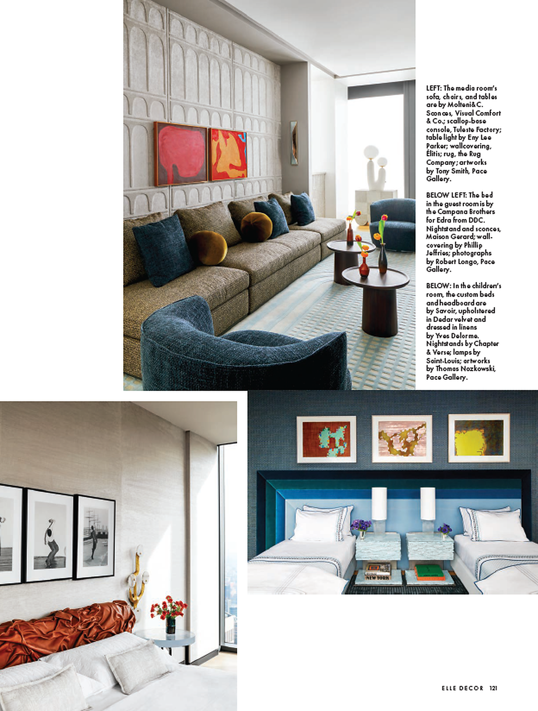 In article, "On Cloud Nine," Fox Nahem featured in the ELLE DECOR 53 West 53 penthouse, Sculpted Wood 2811 Parisian Pale in the primary bedroom, Dojo Weave 8621 Navy Plait in a bedroom, Velvet Vibes 9465 Craft Paper Tan in a bedroom, and Ripples 9265-A Bookmatched Taupe on Marshmallow Manila Hemp in the Media Room Nook.