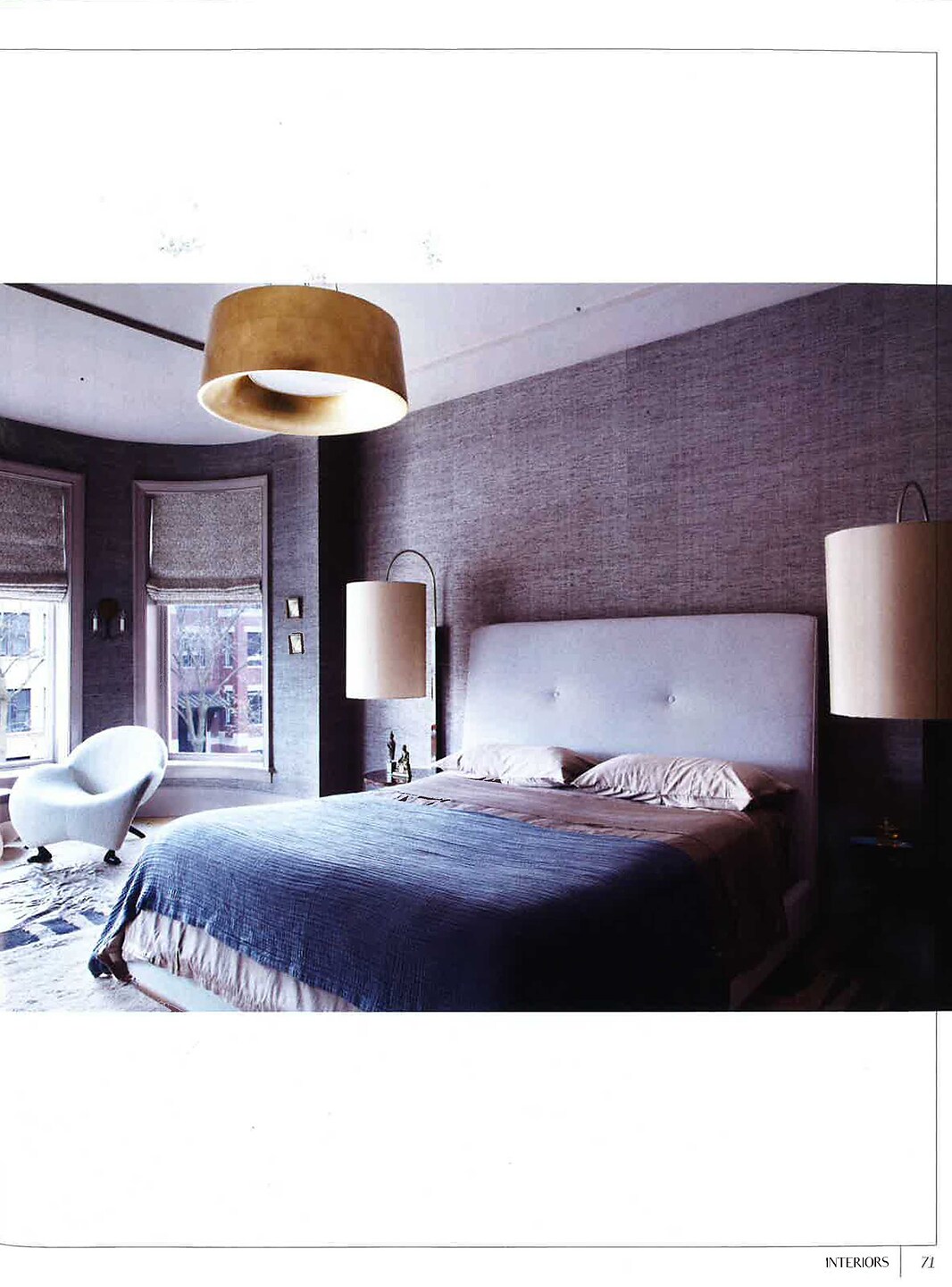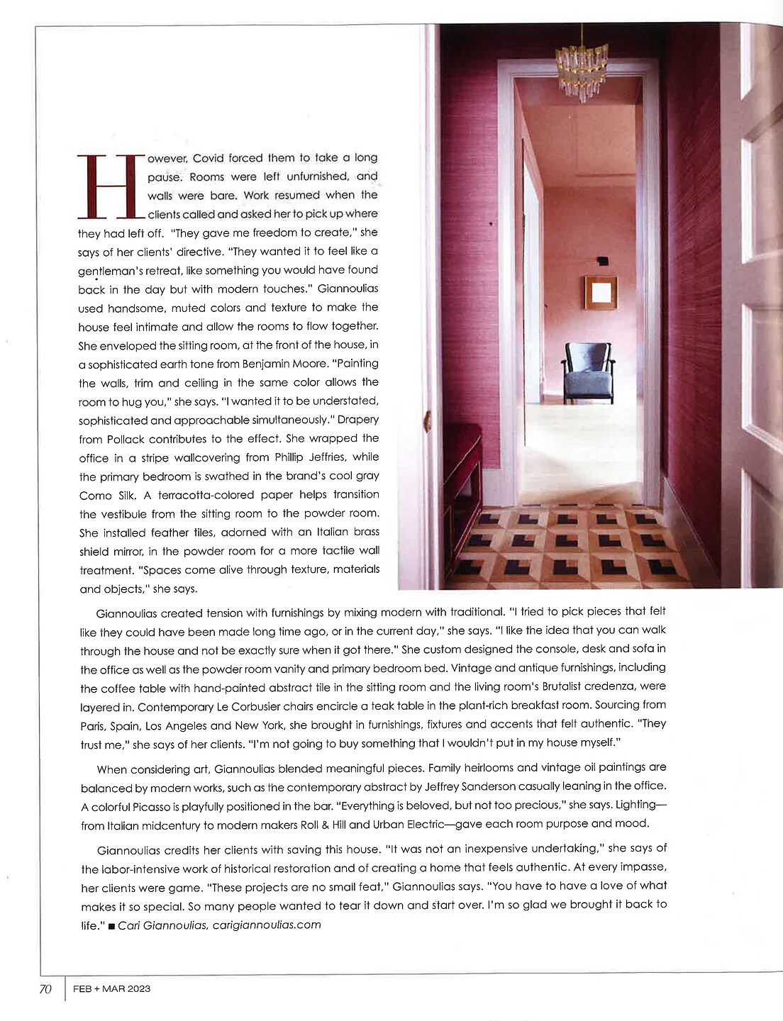 In the article, "A New Life," interior designer Cari Giannoulias featured Bermuda Hemp 5251 Fuchsia in the office, Amalfi Silk 4390 Coast in the bedroom, and Origin Weave 1621 Sumac Grey  in the living room of a client's home. In the article,"In Context," interior designer Ray Booth/Mcalpine featured Bermuda Hemp 5526 Egyptian Blue in the dining room of a client's home.