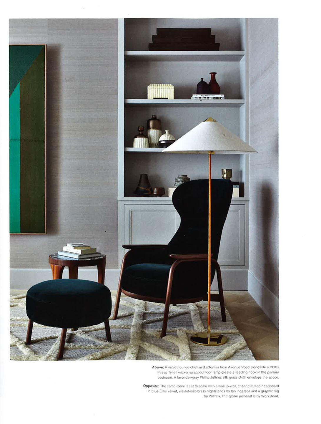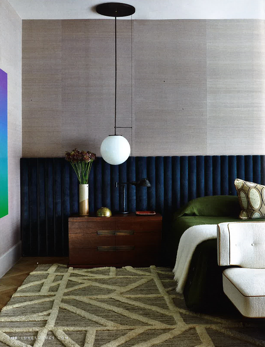 In article, "Art De Vivre," interior designer Kevin Dumais featured Amalfi Silk 3217 Alexander the Grey in the bedroom of a client's home.