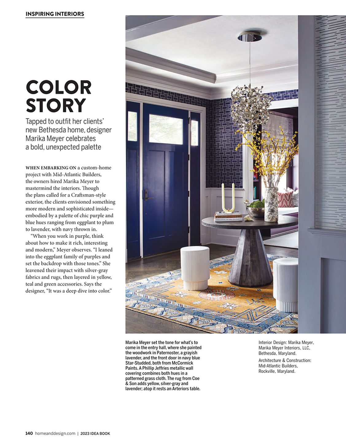 In article, "Color Story," interior designer Marika Meyer features Woven Wood 4267 Navy Loom in the foyer and Zebra Grass 3358 Grazing in the bookshelf of a client's home.