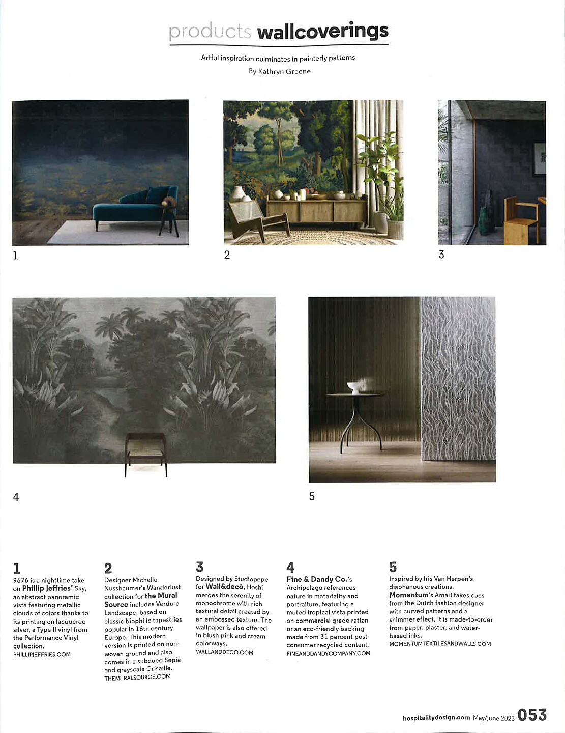 In article, "Products Wallcoverings," Phillip Jeffries' Sky 9676 Midnight on Lacquered Silver Vinyl Metalworks is featured among new wallcovering products.