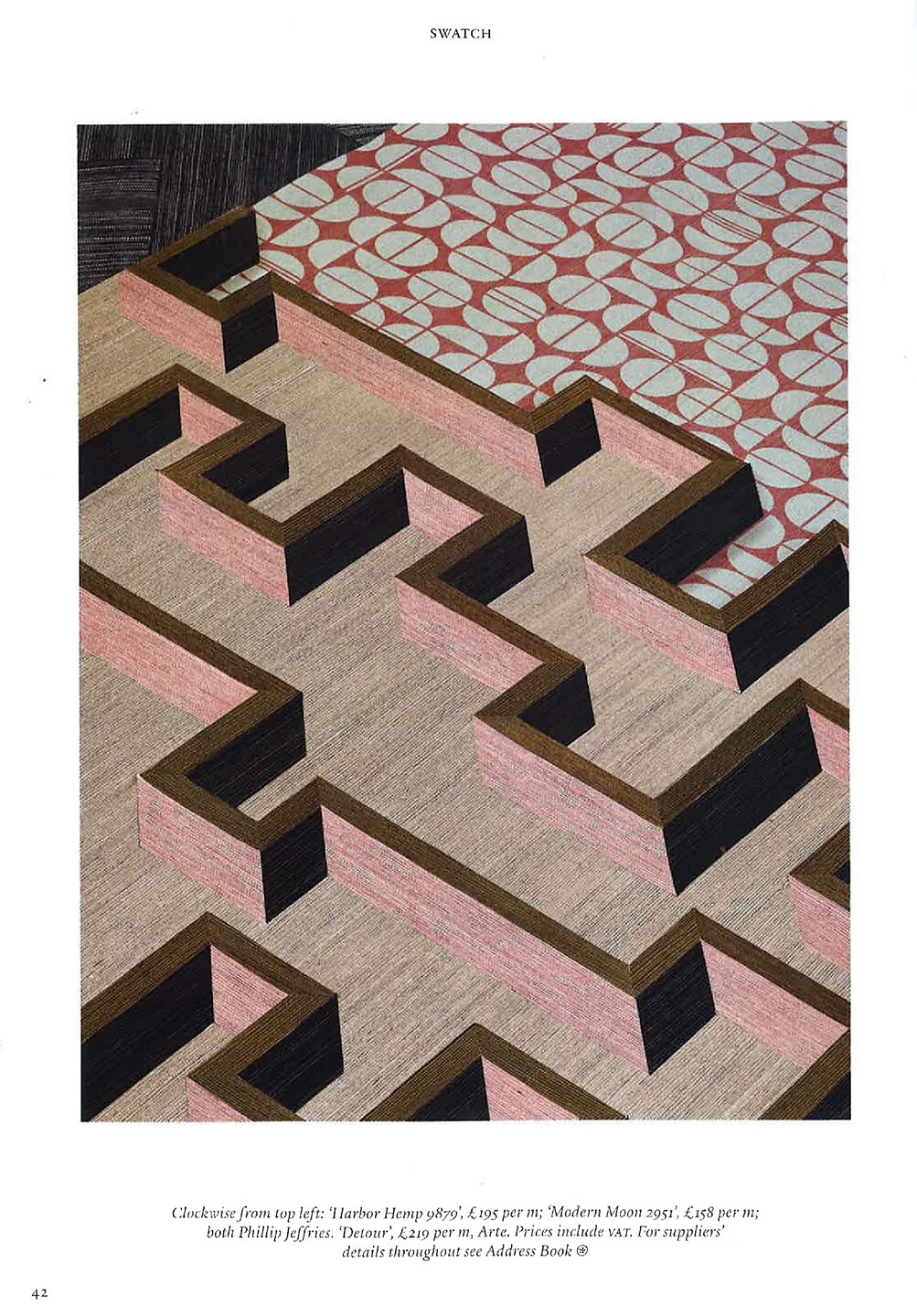 In article, "Cutting Shapes," Harbor Hemp 9879 Black Landing and Modern Moon 2951 are featured among geometric wallcovering shapes.