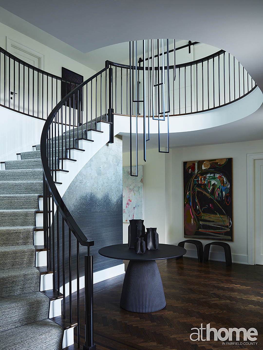 In article, "Collector’s Addition," interior designer Stirling Mills featured Metallic Ombre 3162 Pewter on Sheltand Horsehair in the stairwell of a client's home.