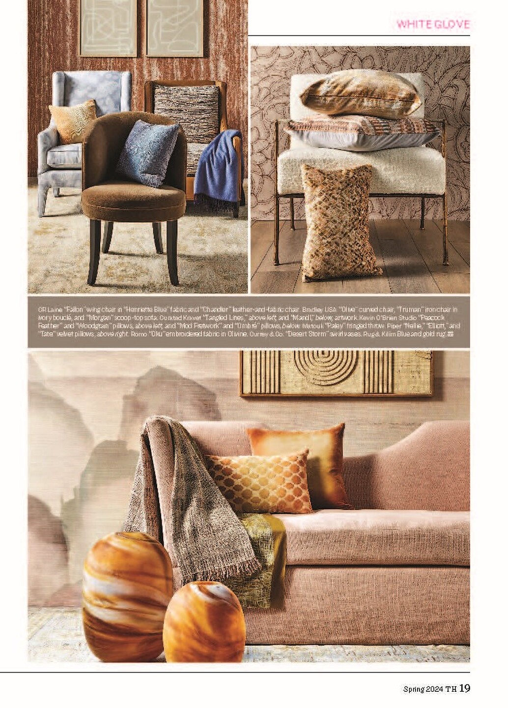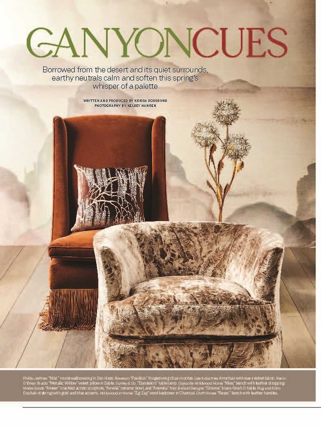 In article,"Canyon Cues," Mist 4799 Sun Haze on Venetian Glass Glam Grass and Mirage 8728 Sands of Time on Marshmallow Manila Hemp featured among desert and earthy palette collections.