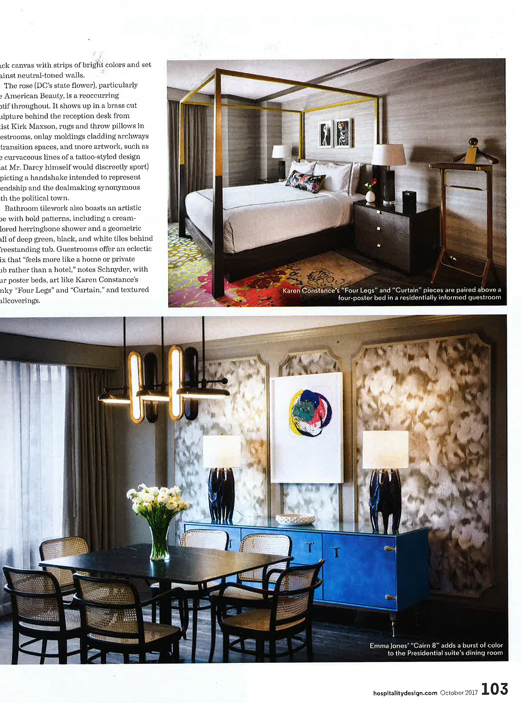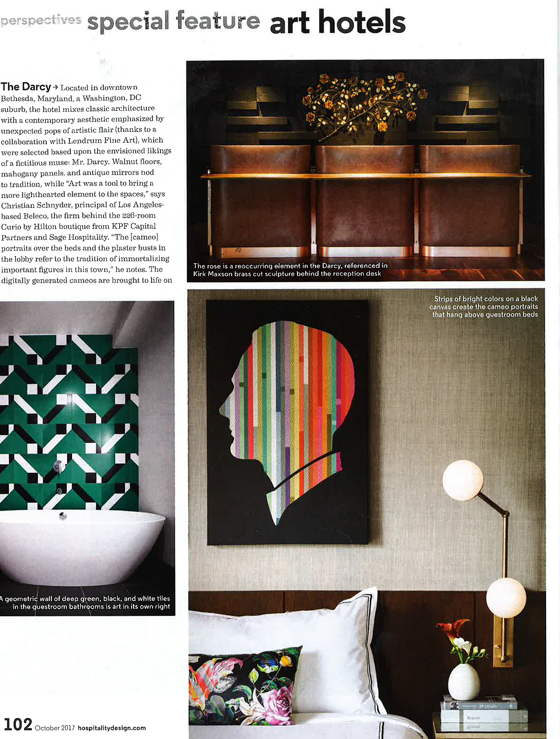 In article, "Art Hotels," interior designer Christian Schnyder featured Vinyl SIlk & Abaca 8097 Alexander the Grey in the presidential suite and Vinyl Fauxy Leather 7662 Burlesque Black in The Darcy Hotel in Bethesda, Maryland.