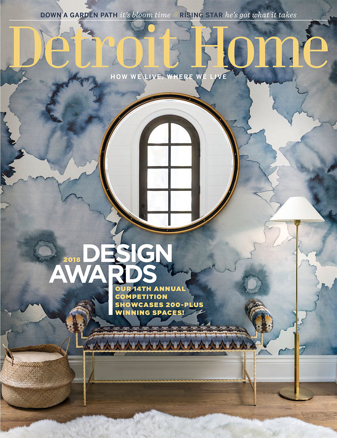 On the cover and in article, "2018 Interiors Wall Treatment," interior designer Dayna Flory Interiors featured Bloom 7192-L Indigo on White Manila Hemp in the foyer of a client's home.
