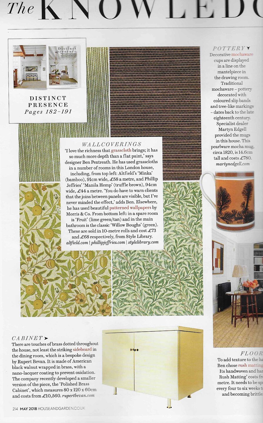 In article, "The Knowledge," interior designer Ben Pentreath featured Manila Hemp Truffle Brown among his favorite design elements.