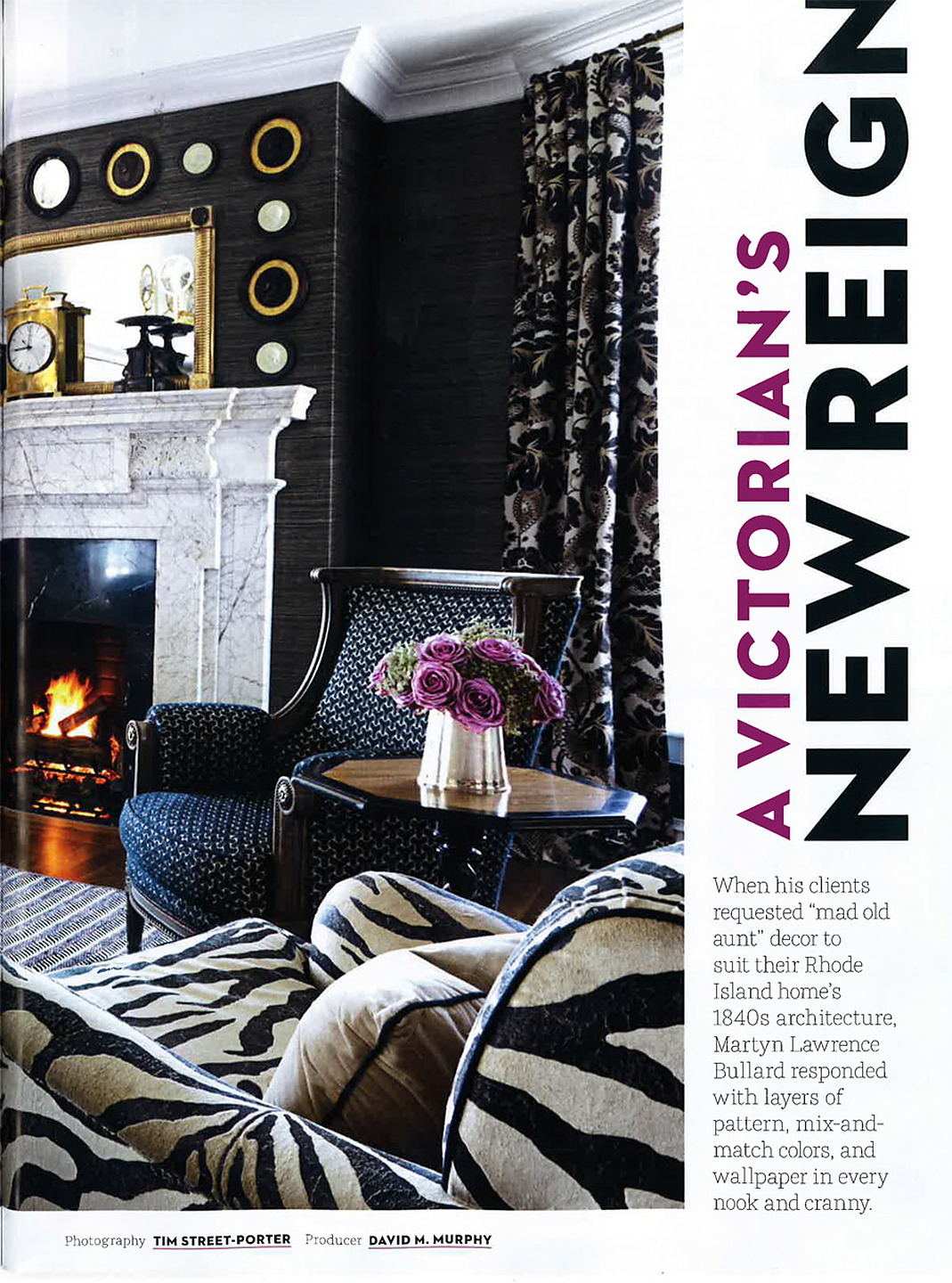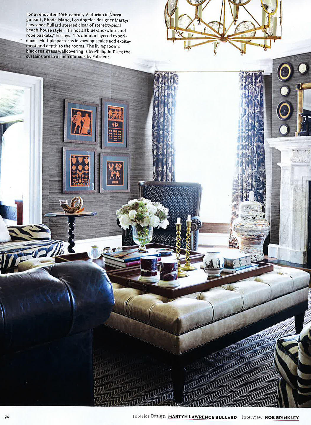 In article, "A Victorian's New Reign," interior designer Martyn Lawrence Bullard featured Soho Hemp 5281 Black & White in the living room of a client's home.