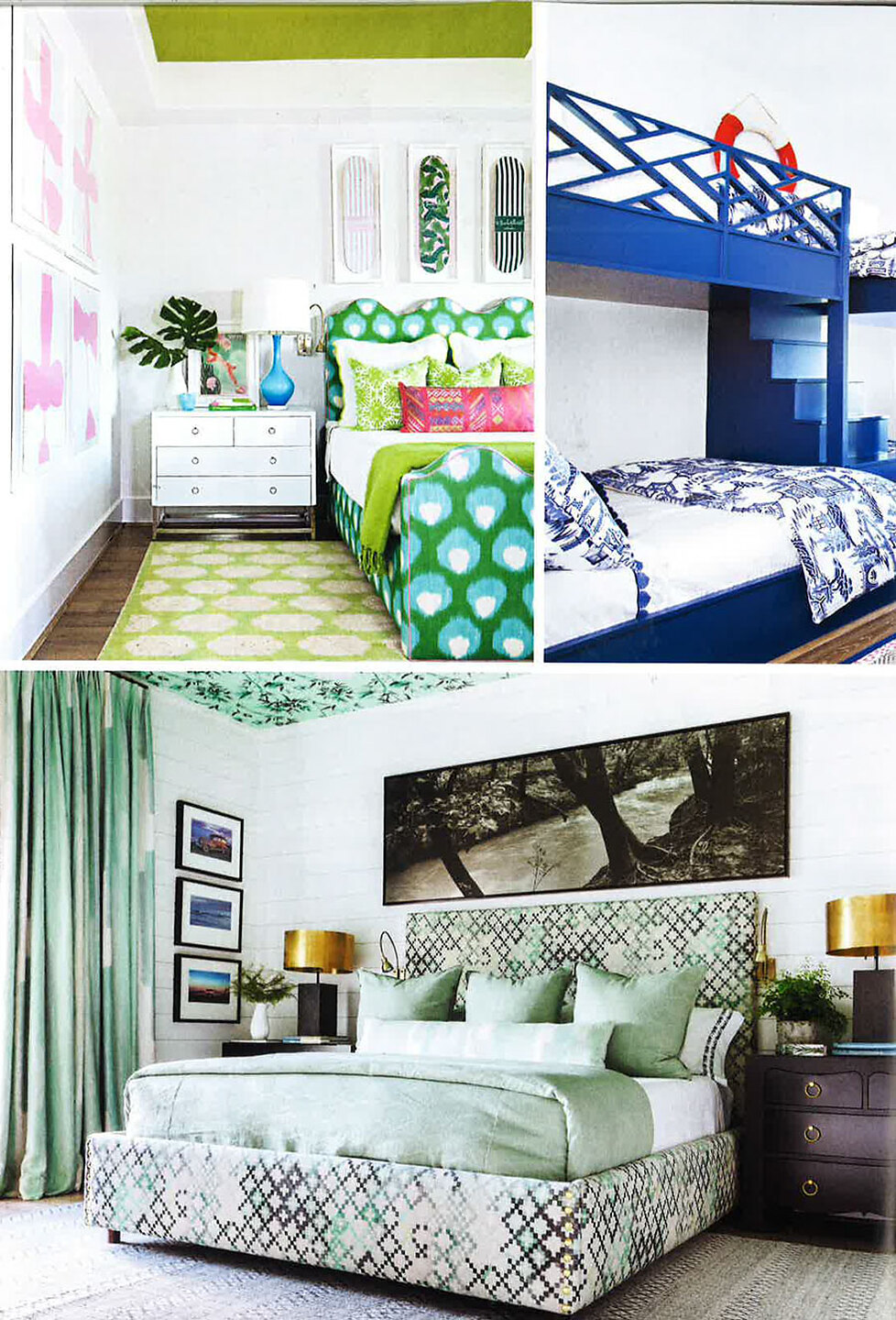 In article, "Playful Twist," Interior designer Courtnay Tartt Elias featured Juicy Jute 4823 Split Pea on the ceiling of a bedroom in her client's home.