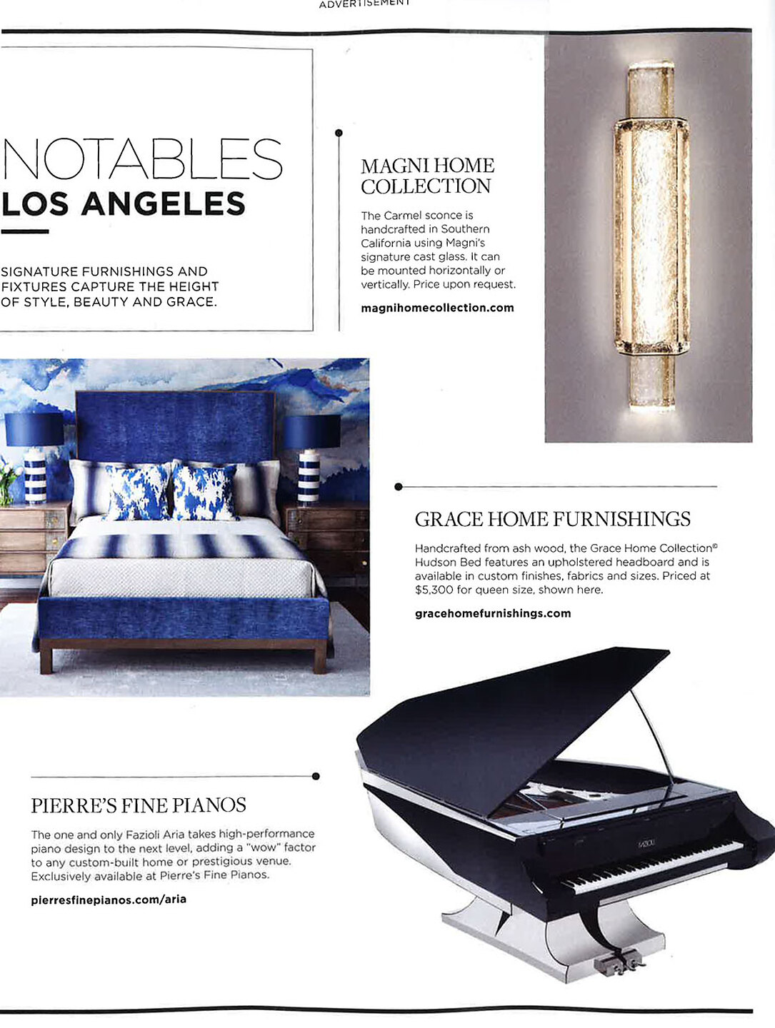 In article, "Notables Los Angeles," Grace Home Furnishings featured Beyond 7202 Indigo Horizons on Vinyl Glam Grass in their advertisement. In article, "Practical Magic," Interior designer Adam Hunter featured Suede Lounge 4321 Japanese Kabuki Suede Royal Navy in the office of a client's home.