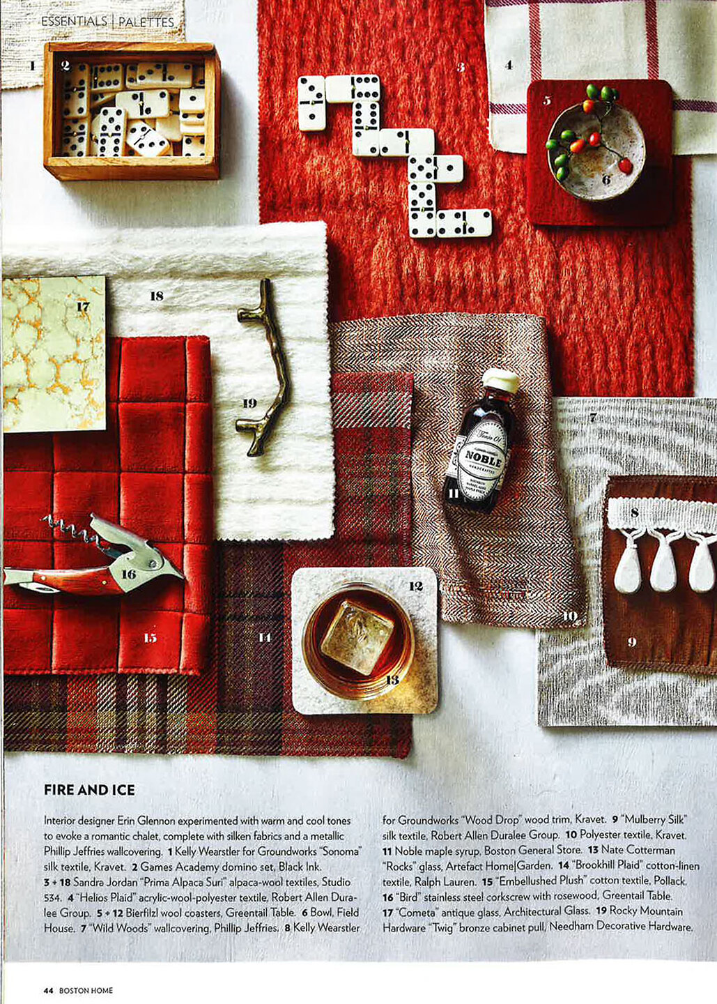 In article, "Fire and Ice," Wild Woods 7902 Everglades Gold is featured as a metallic fabric to evoke a romantic chalet.